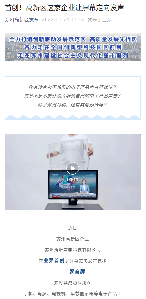《全球首創!高新區這家企業讓屏幕定向發聲》